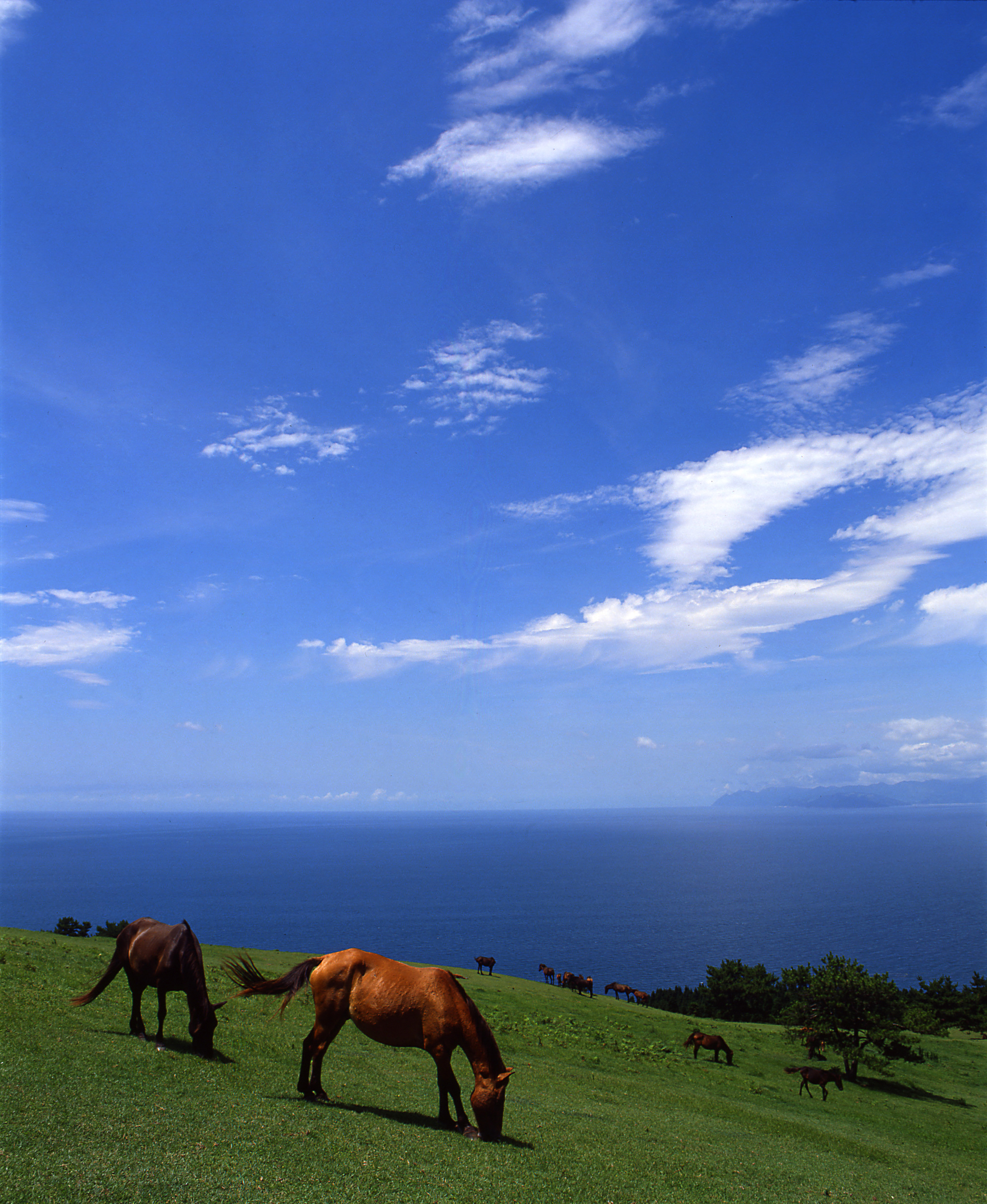 宮崎県都井岬で人為的な管理はほとんど加えられず、半野生状態に近い形で飼養されてる日本在来馬。毛色は、鹿毛、黒鹿毛が多い。